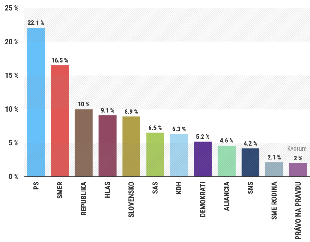 Po prepočítaní hlasov na mandáty by progresívci obsadili 39 kresiel v parlamente. Smer by mal o desať menej, čiže 29 mandátov, a Republiku by v NR SR zastupovalo 18 poslancov. Hlas i matovičovci by získali zhodne po 16 mandátov. SaS by malo v NR SR 12 poslancov, KDH 11 a Demokrati 9. Súčasné koaličné strany Smer a Hlas by koalíciu nedokázali vyskladať ani s pomocou Republiky, spoločne by mali 63 poslancov. PS, KDH, SaS a Demokrati by mali spolu 71 mandátov, a teda ak by chceli dosiahnuť nadpolovičnú väčšinu v NR SR (viac ako 75 mandátov), potrebovali by aj Igora Matoviča a jeho hnutie. S nimi by mali 87 poslancov.