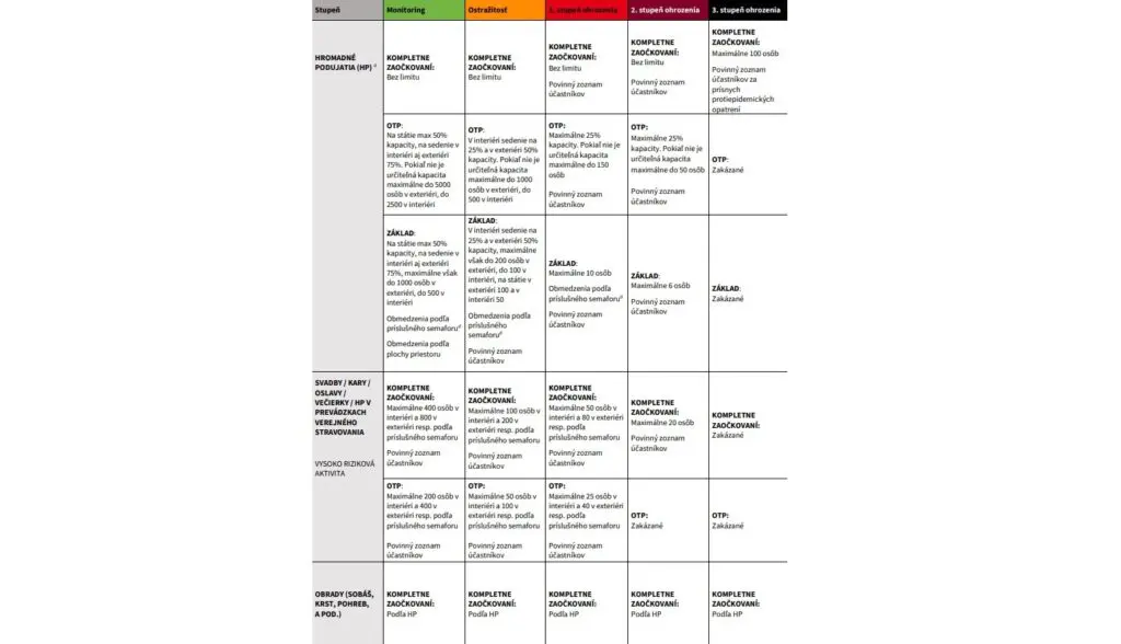 Od pondelka bude platiť iba 5 farieb v COVID Automate (zelená, oranžová, červená, bordová a čierna). Jednotlivé farby predstavujú stupeň obmedzení v jednotlivých okresoch, pričom v každom stupni budú platiť určité obmedzenia, ako doteraz. Čo sa však od pondelka mení je fakt, že si organizátori alebo prevádzkovatelia zariadení budú môcť vybrať z troch protokolov: ZP – Základný protokol, OTP – očkovaní, testovaní, prekonaní, KZ – kompletne zaočkovaní.