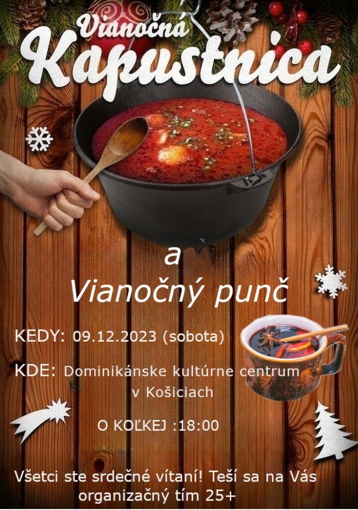 V DKC Veritas o 18:00 sa s blížiacimi sviatkami začína očakávaná predvianočná oslava. Čaká vás pohodová atmosféra, skvelá kapustnica, ešte lepší punč a, samozrejme, ten správny pomer duchovna a zábavy. Príďte sa tešiť z prichádzajúcich sviatkov a zažite tú pravú vianočnú atmosféru plnú radosti a dobrej nálady.