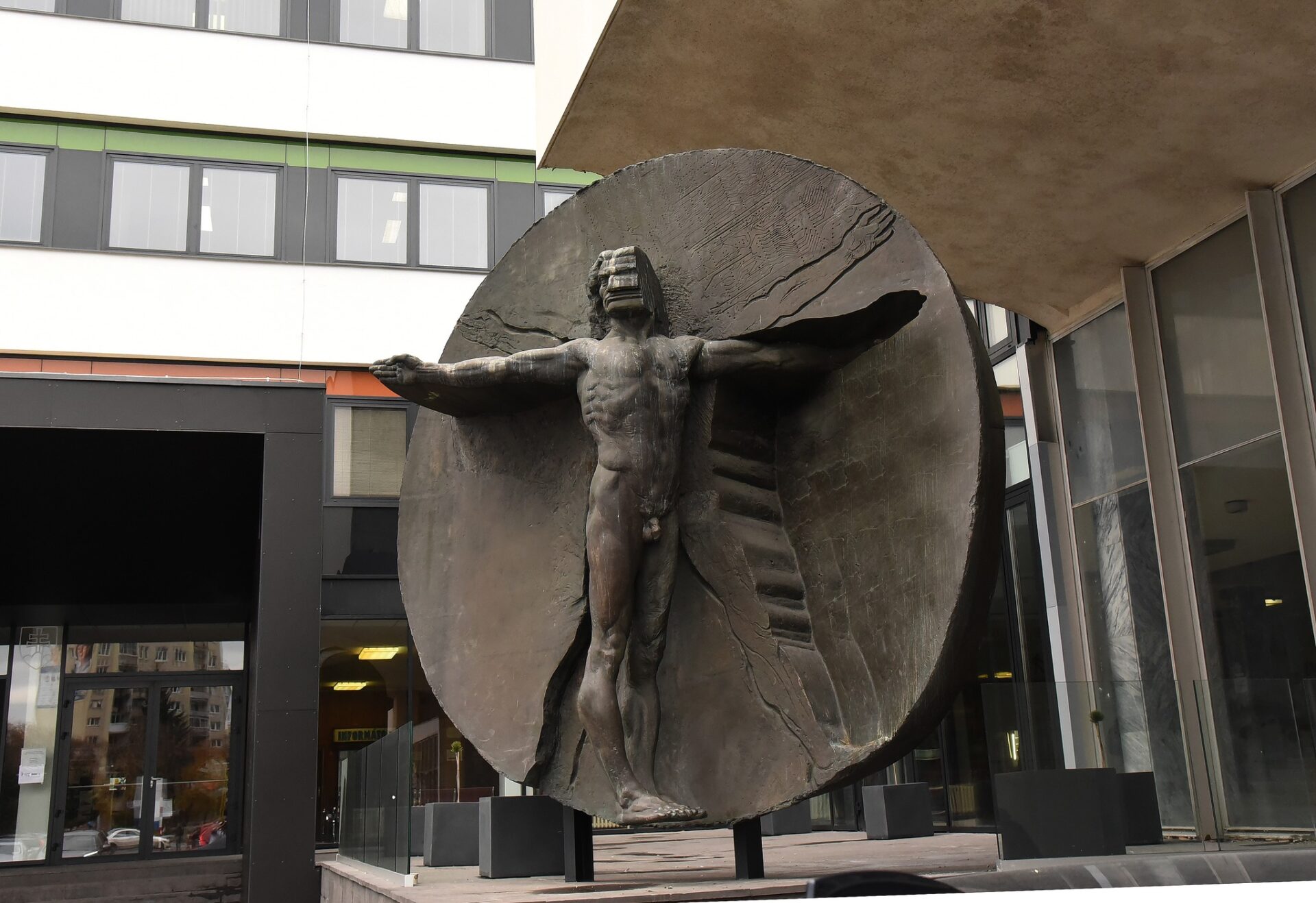 Pri hlavnom vchode do budovy LF sa nachádza monumentálna bronzová plastika od košického sochára Juraja Bartusza. Vyhotovená bola v rokoch 1982 – 1990 a jej motívom je slávna ilustrácia od Leonarda da Vinciho – kresba vitruviánskeho muža, ktorého proporcie sú vpísané do kružnice a štvorca ako dvoch základných geometrických tvarov.