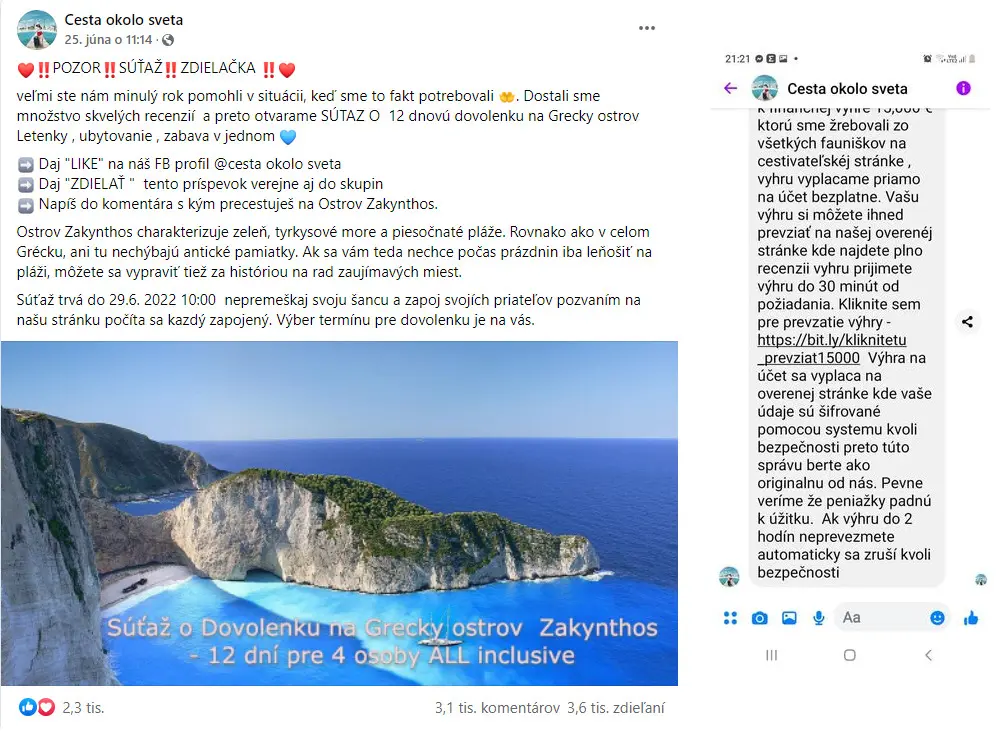Ak ste jeden z tých, ktorí majú založený facebookový profil, takmer určite ste sa aspoň raz zapojili do súťaže o mobil, dovolenku, kozmetický výrobok či iné hodnotné veci. Samozrejme, nie všetky stránky sú falošné, preto je veľmi dôležité si overiť, kedy vznikol účet, aký je počet sledujúcich, prípadne, či neexistuje viacero stránok s rovnakým názvom. Jeden z novších prípadov je aj podvodná súťaž o dovolenku na Grécky ostrov, o ktorej informovala polícia prostredníctvom facebookovej stránky Hoaxy a podvody – Polícia SR.