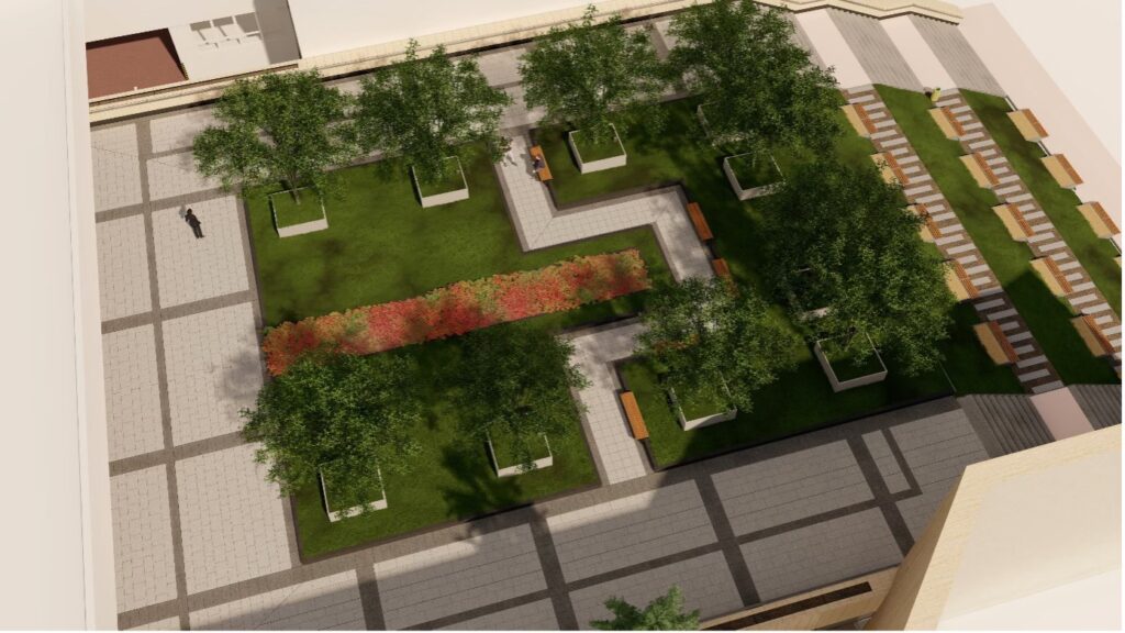Vzniknú dve odlišne stvárnené časti prepojené chodníkom s lavičkami, ktoré budú zadržiavať dažďovú vodu na celkovej ploche 500,2 m2. Prvá časť bude priamo nadväzovať na schodisko, ktoré sa revitalizovalo v rokoch 2022 a 2023. Tým sa vytvorí pokračovanie veľkoplošného trvalkového záhonu, ktorý prinesie farbu a život do priestoru. Druhú časť vegetačnej plochy bude riešená ako zatrávnená plocha s centrálnym parterom, ktorý bude tvoriť pestrá zmes kvitnúcich trvaliek. Pôjde o vodozádržné opatrenia na adaptácie zmeny klímy.