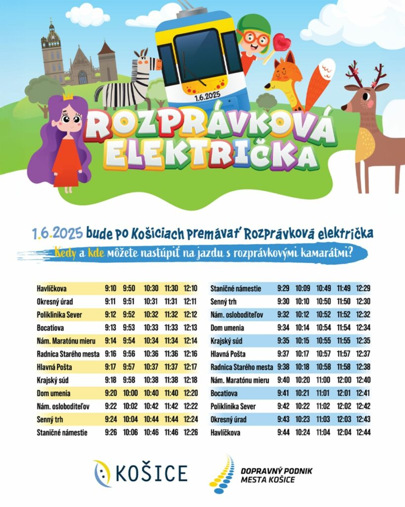 V nedeľu na Medzinárodný deň detí organizuje Dopravný podnik akciu „Rozprávková električka“. Električka č. 807 bude premávať od 09:00 do 13:00 hod. na trase linky č.2 (Havlíčkova – Staničné námestie). Pre všetky deti je pripravený o – neváhajte a príďte sa odviezť s celou rodinou!