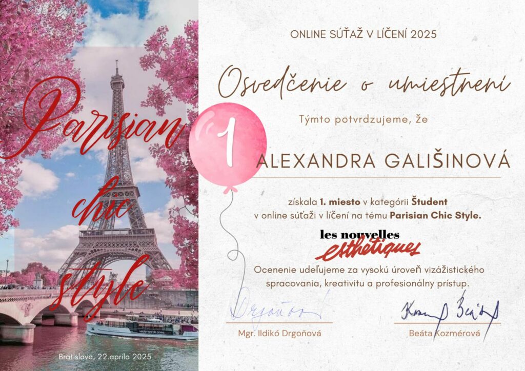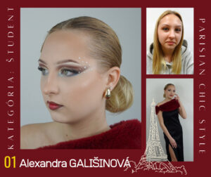 „Líčenie Alexandry Gališinovej nás v porote okamžite zaujalo. Je to ukážka precíznej techniky, výborného citu pre farebnú harmóniu a krásne zvládnutého kontrastu medzi jemnosťou a dôrazom na detaily. Výrazné pery, sofistikované očné tiene a originálne zakomponované perličky vytvárajú efekt, ktorý je elegantný, no zároveň moderný a osobitý – presne ako ‘parížsky šik’, ktorý sme v tejto súťaži hľadali. Takéto súťaže sú pre mladých talentovaných vizážistov výbornou príležitosťou ukázať, čo dokážu. Alexandra dokázala, že má nielen technické zručnosti, ale aj umelecký pohľad a odvahu vyjadriť vlastný štýl. Blahoželám nielen jej, ale aj jej pedagogickému vedeniu, pretože za každým šikovným študentom je aj niekto, kto ho podporuje a vedie. Teším sa na ďalšie talenty, ktoré z tejto školy vyrastú,“ uviedla Mgr. Ildikó Drgoňová, šéfredaktorka magazínu Les Nouvelles Esthétiques Slovenské vydanie a odborná porotkyňa online súťaže líčenia Parisian Chic Style.