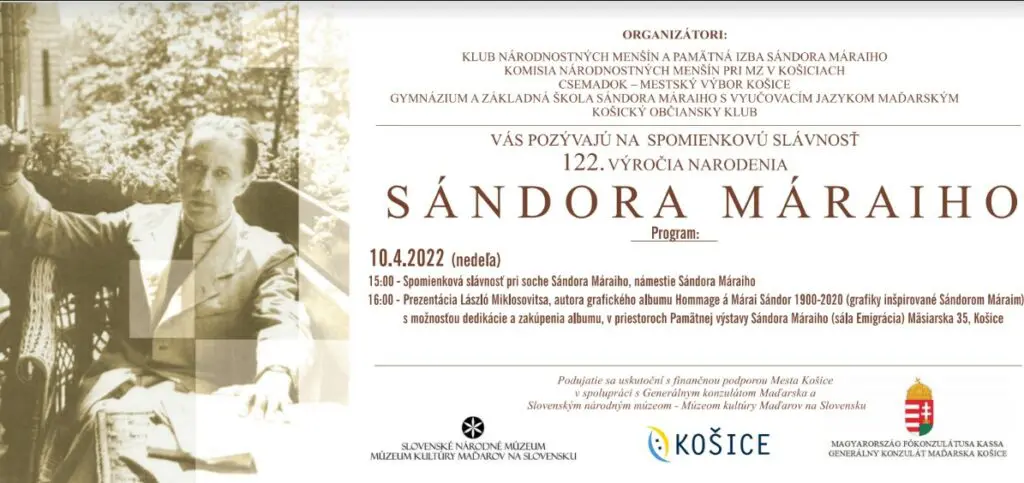 V pondelok (11. apríla 2022) si pripomenieme už 122. výročie narodenia Sándora Máraiho, významného maďarského spisovateľa a novinára. Pri príležitosti tohto výročia sa v nedeľu (10. 4.) uskutoční Spomienková slávnosť.