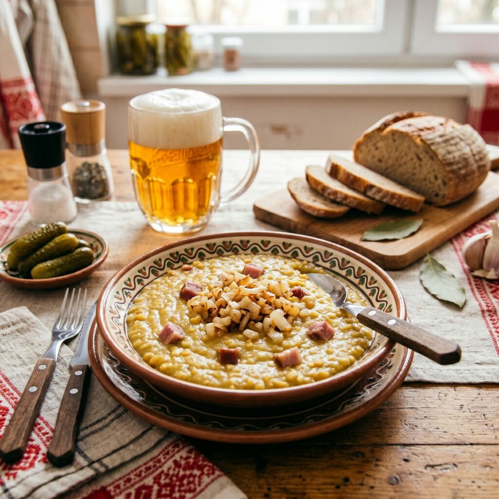 Hrachová kaša s údeným mäsom je tradičné, sýte jedlo, ktoré sa podáva najčastejšie s chlebom a kyslou uhorkou. Výborne chutí aj na druhý deň, keď sa chute ešte viac prepoja.