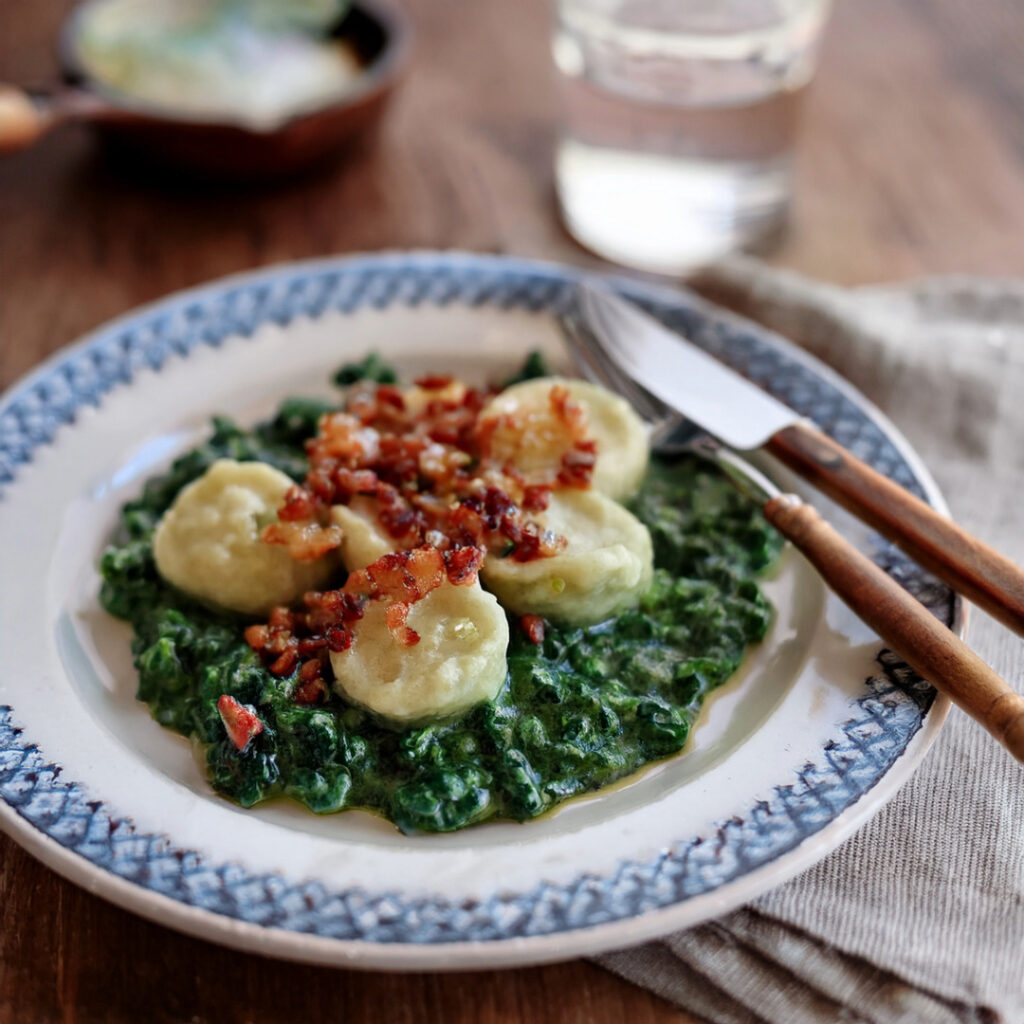 Špenátové halušky s opečenou slaninou a cesnakom spájajú tradičný slovenský pokrm s čerstvou chuťou zelene. Jednoduché zemiakové cesto doplnené špenátom, chrumkavá slanina a voňavý cesnak vytvárajú dokonalú kombináciu pre výdatný obed či večeru, ktorá zahreje a zasýti.