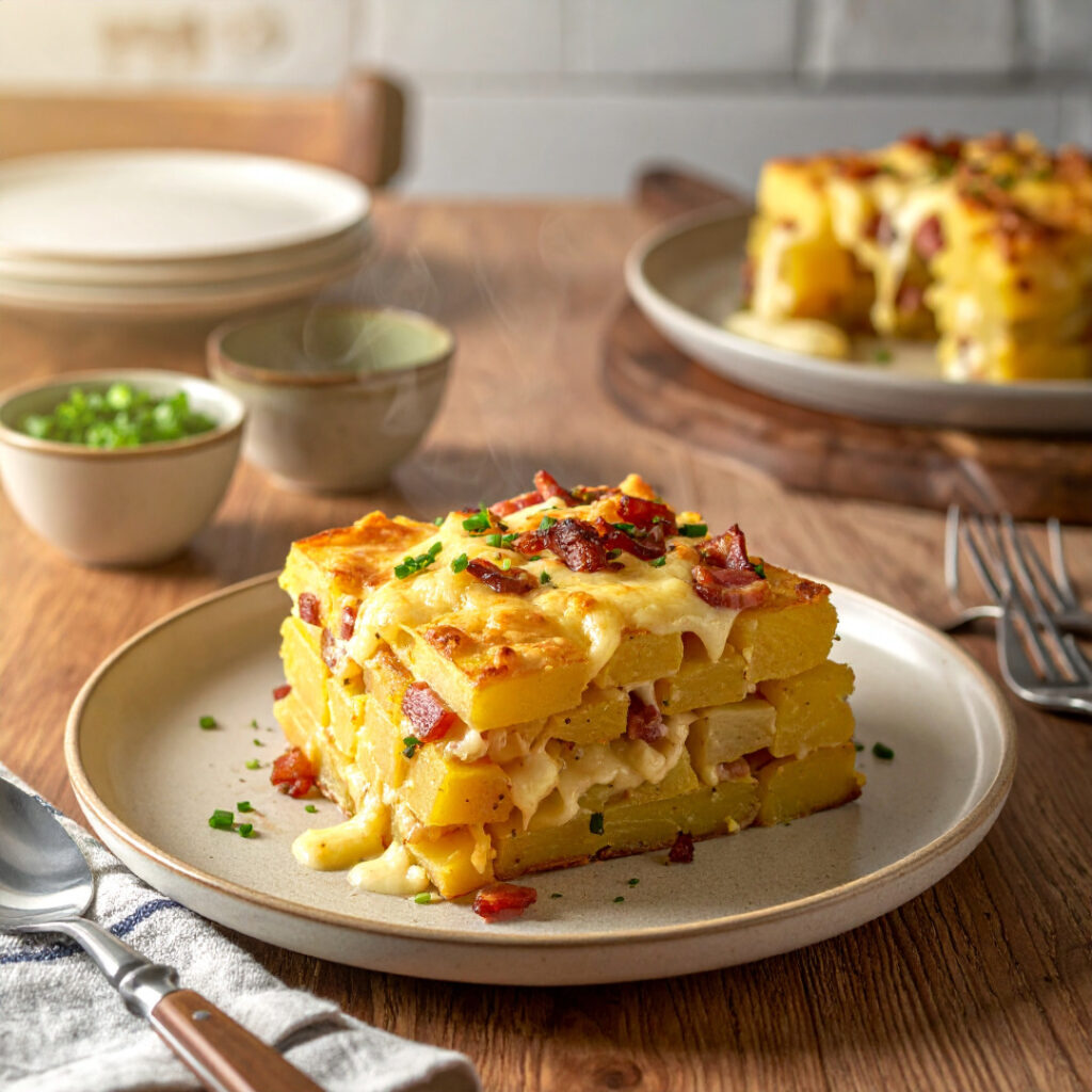 Tradičné zapekané zemiaky so slaninou a bryndzou patria medzi jedlá, ktoré spájajú jednoduchosť prípravy s výraznou, poctivou chuťou. Kombinácia zemiakov, údenej slaniny a bryndze vytvára sýte jedlo vhodné ako hlavný obed či večera, ktoré ocenia najmä milovníci slovenskej kuchyne.