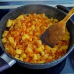 - Pridajte pretlačený cesnak, krátko premiešajte a vsypte obe papriky – hneď potom zalejte trochou vody, aby sa nepripálili.
